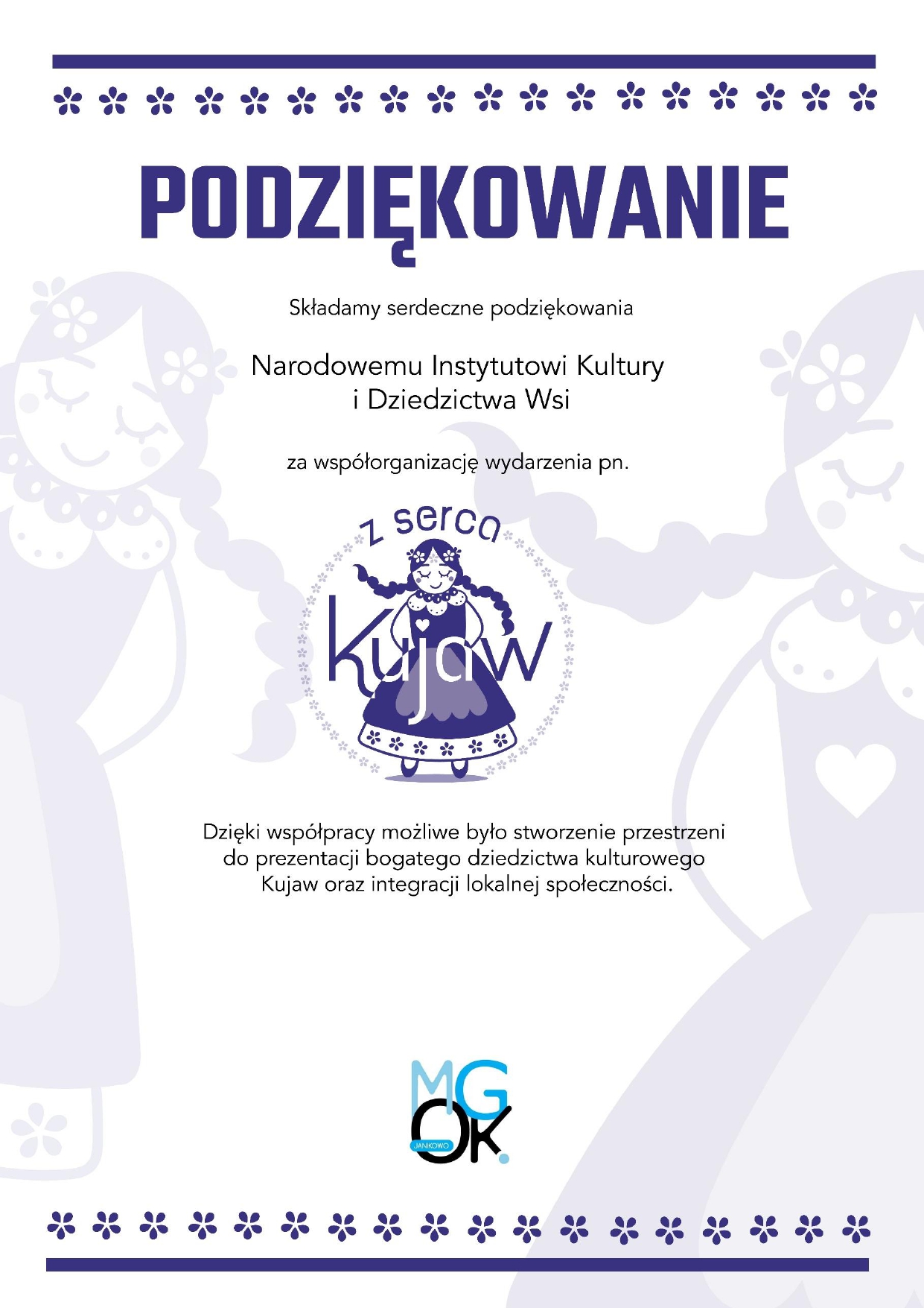 Z ogromną radością informujemy, że nasz projekt „Z serca Kujaw” otrzymał dofinansowanie i zostanie zrealizowany we współpracy z Narodowym Instytutem Kultury i Dziedzictwa Wsi, który jest współorganizatorem wydarzenia.